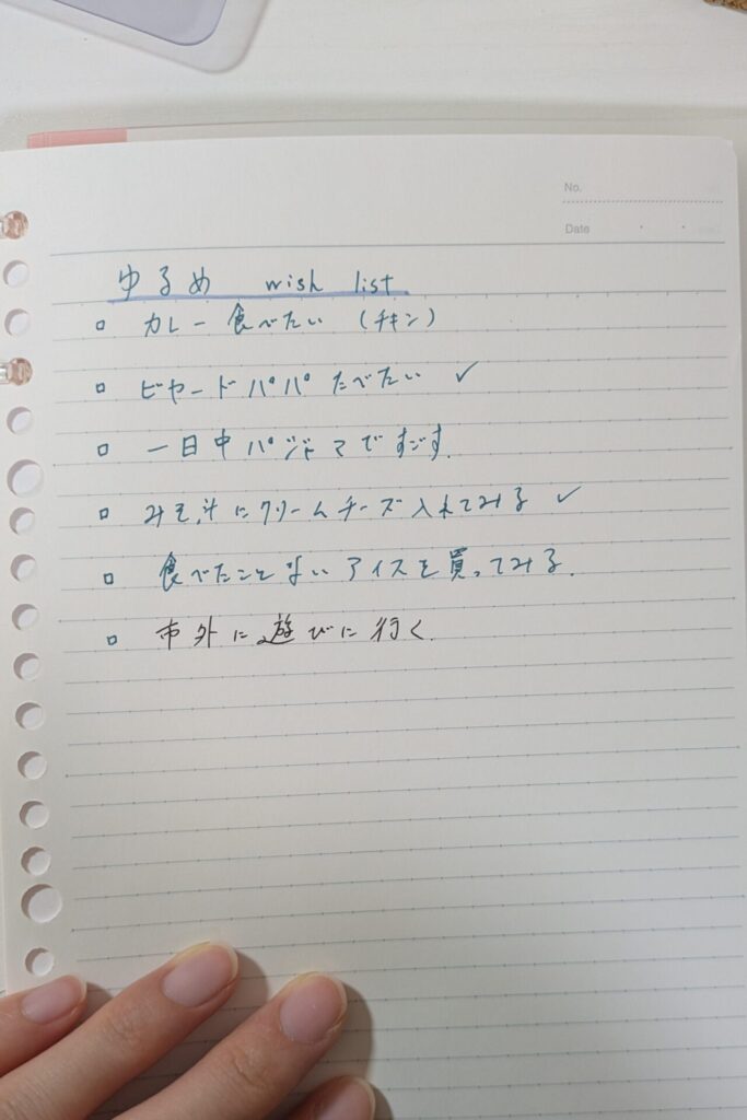 完璧主義な部分がある私はウィッシュリストを書くと、絶対に叶えなければならないというプレッシャーを感じて苦しくなることがあります。別に出来なくても大丈夫なことだとわかっていてもです。でも最初から「ゆるめ」と名付けることでそのプレッシャーがなく、気楽に過ごすことができました